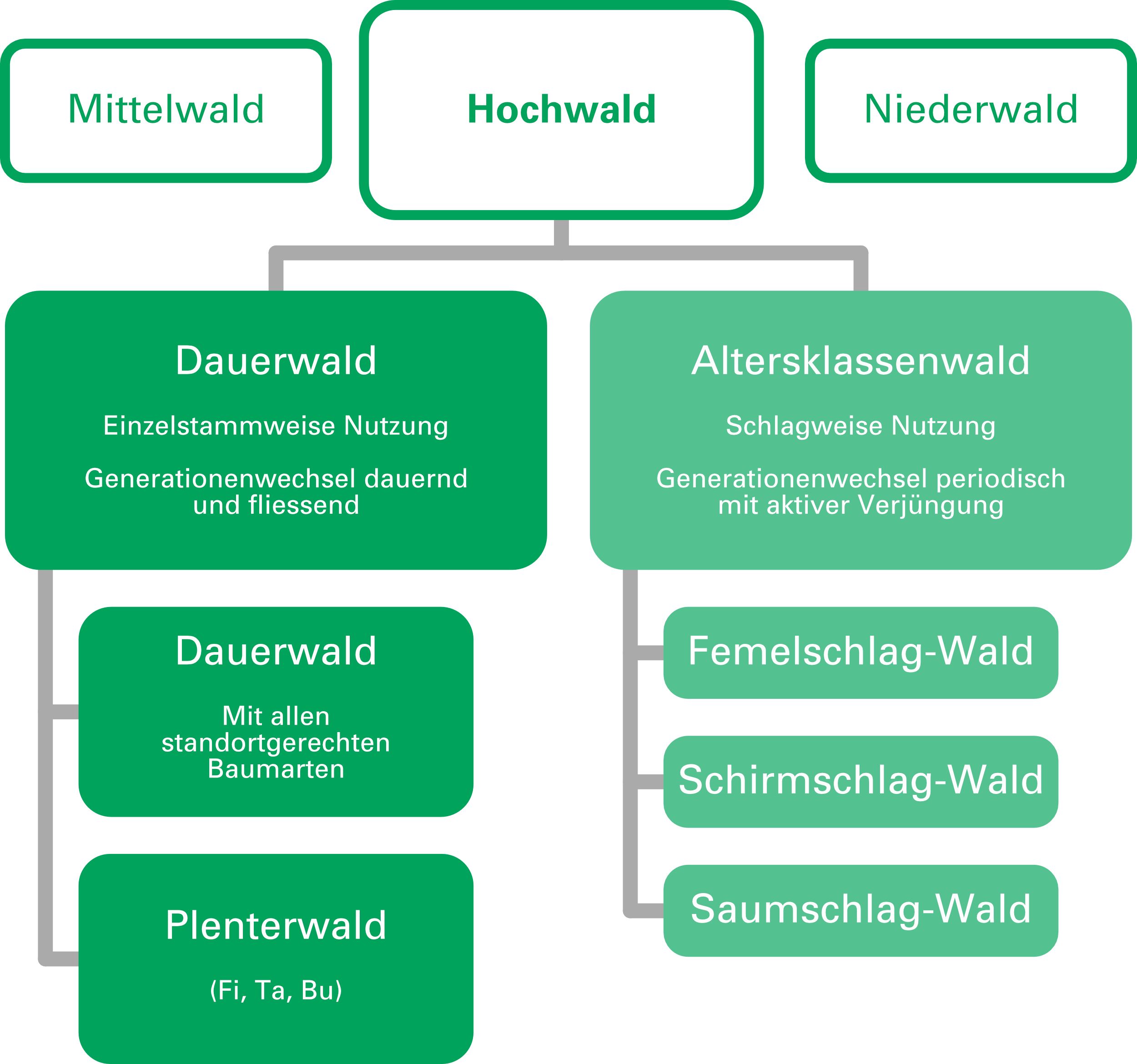 Im gleichgewichtigen Dauerwald sind keine Bestände nach Alter oder Struktur abgrenzbar. In den Altersklassenwäldern treten die verschiedenen Baumgenerationen als räumlich getrennte gleichaltrige Bestände auf.